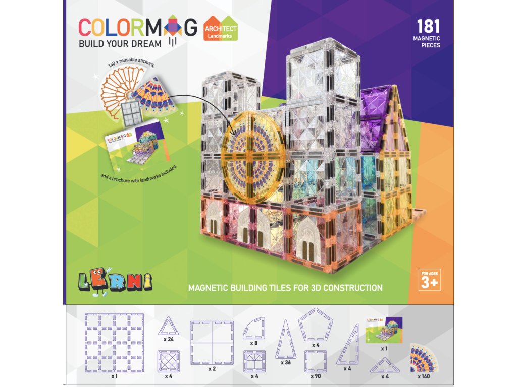 Snívajte o veľkolepých stavbách z celého sveta s novinkou COLORMAG ARCHITECT! Táto jedinečná magnetická stavebnica umožňuje zhotoviť slávne stavby naprieč históriou inšpirované napríklad gotickou katedrálou Notre Dame, rímskym Pantheonom či moderným mrakodrapom Burj Khalifa. S pomocou špeciálne tvarovaných magnetických dielov môžu malí stavitelia objavovať princípy konštrukcie a architektúry pri vytváraní ikonických svetových stavieb. Magnetická stavebnica Architect nadväzuje na ďalšiu radu stavebníc Colormag, ktoré ponúkajú neobmedzené možnosti na hru.