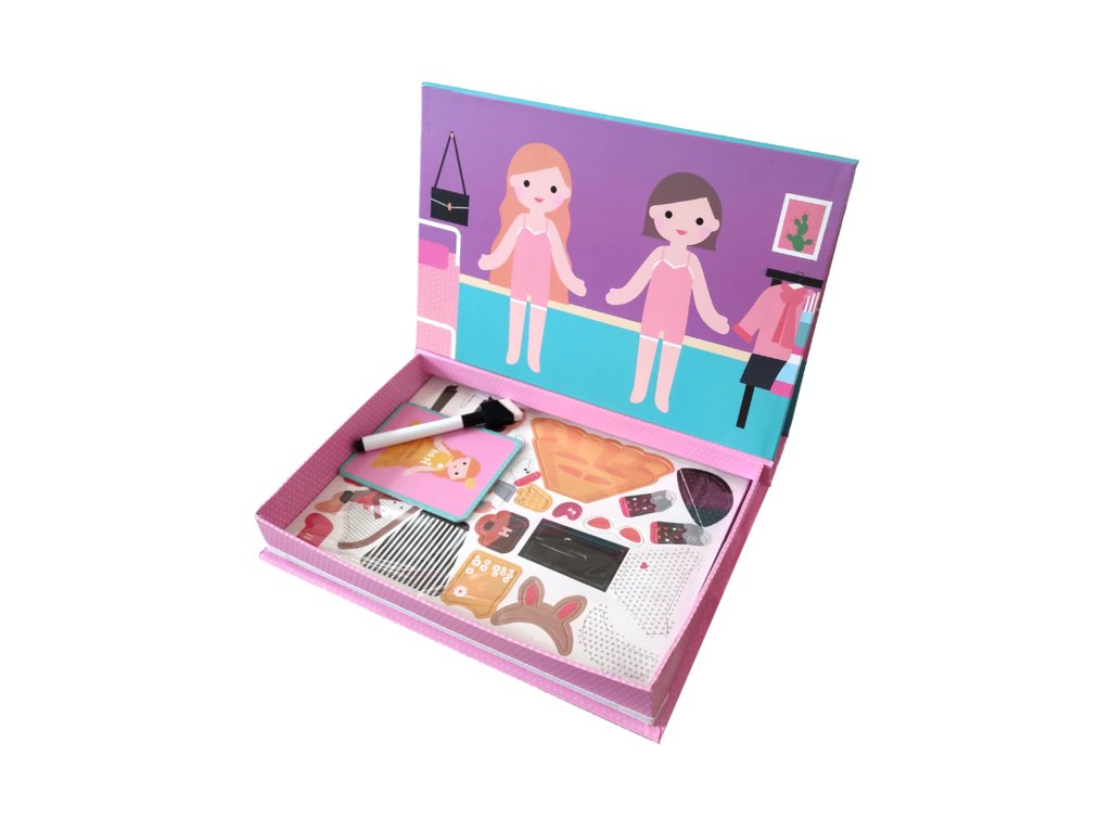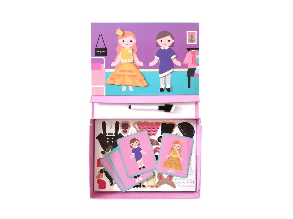 Krátké šaty, kostým na karneval, kostým do práce nebo jednoduché oblečení na doma? Magnetky oblečení zaujmou zejména dívky. Určitě vás potěší, že magnetický kufřík kromě podkladu, na který si z magnetek můžete vytvářet různé oblečení a vymýšlet si příběhy, obsahuje podložku na psaní a kreslení. Přiložená fixa má praktickou houbičku na mazání, a tak můžete psát a kreslit znovu a znovu.