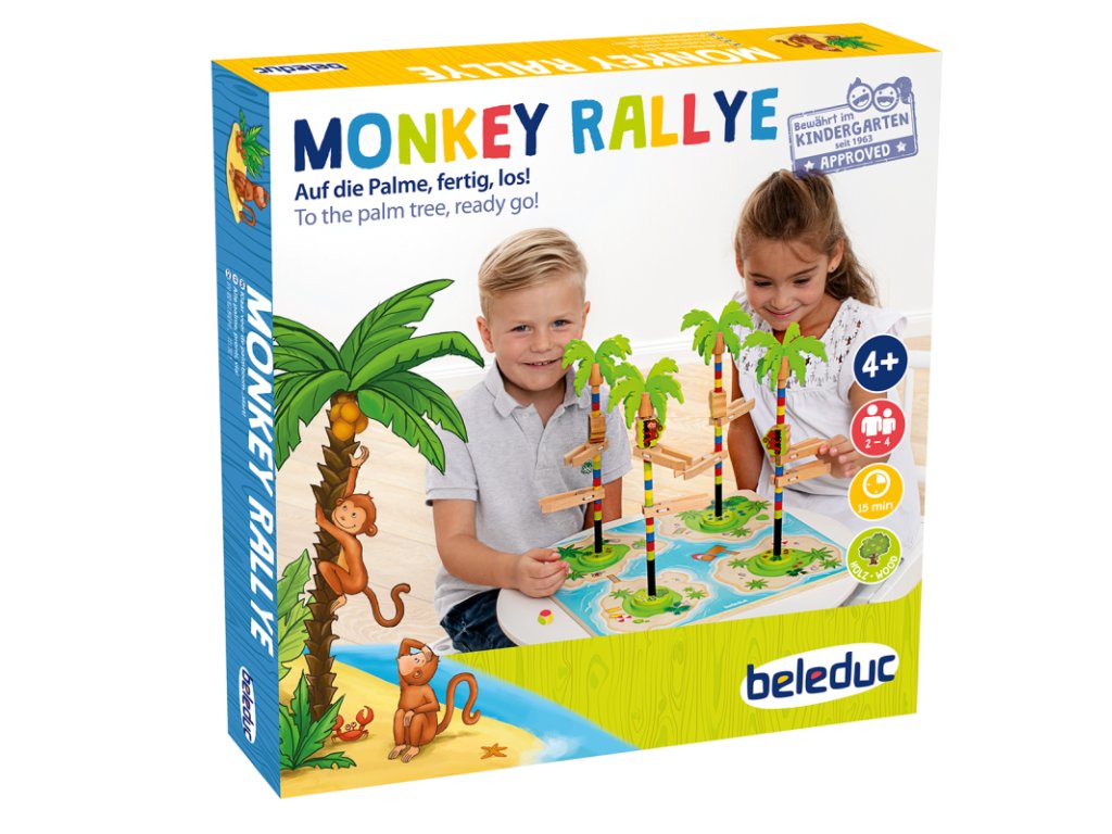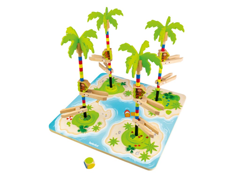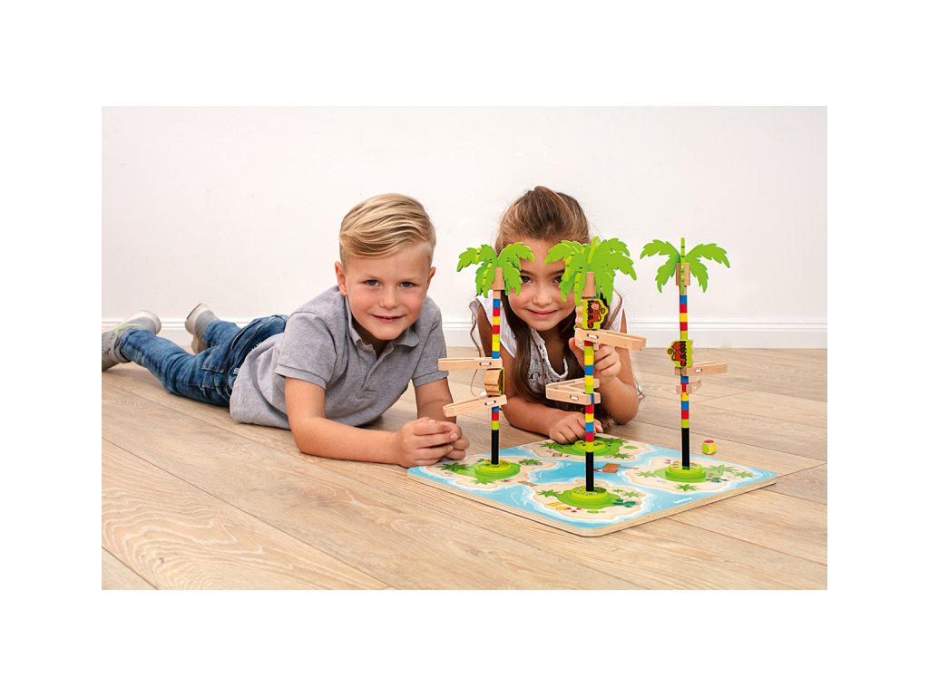 Všechny začínají současně a snaží se být první, které vylezou na svoji palmu. Promyslete si každý svůj tah, protože vždy existuje riziko, že opice na cestě k palmovým listům trochu uklouzne! Která opice bude nejrychlejší a dostane se ke skrytým kokosovým ořechům?