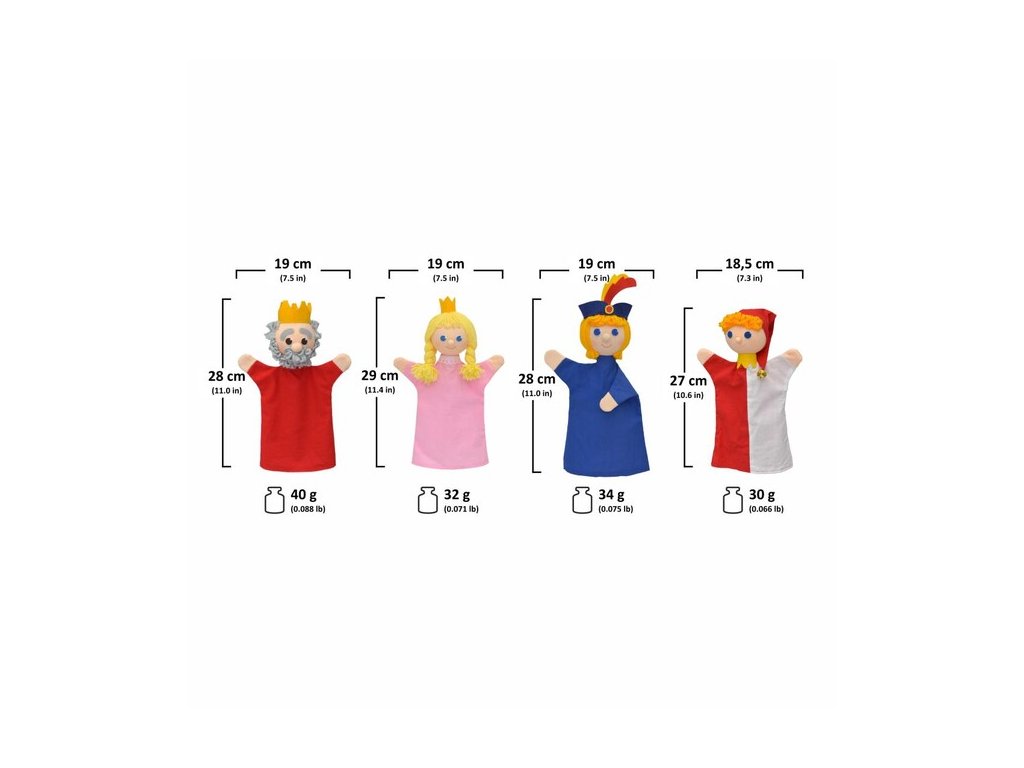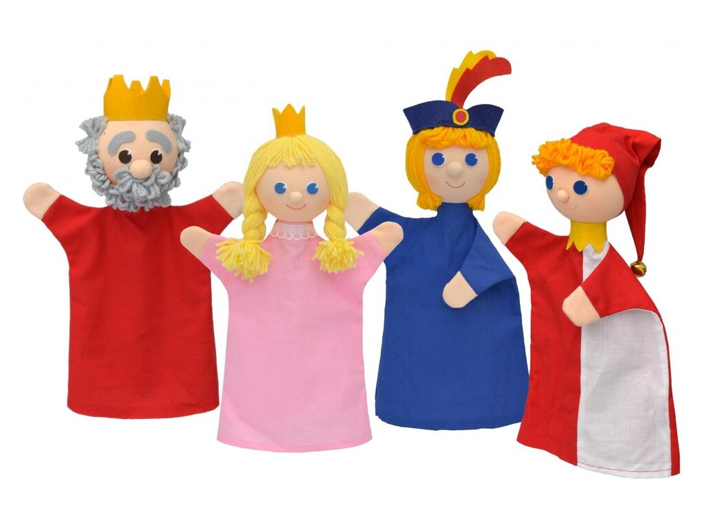 Král chtěl svou dceru potěšit. Ale žádný klaun ji nedokázal rozesmát. Dokud nepřišel veselý princ s veselou hádankou a vtipnými příhodami. Nakonec byla svatba, zazvonil zvonec a pohádky byl konec. Vymyslete si se sadou maňásků různá dobrodružství a příběhy a promluvte je svému děťátku. Hraní s loutky výborně stimuluje jejich fantazii a kreativitu a také jim pomáhá začít osmělit se na veřejnosti.