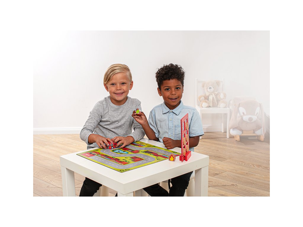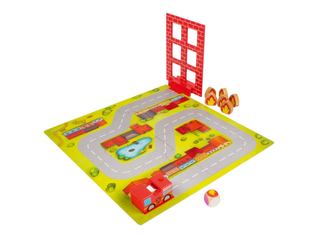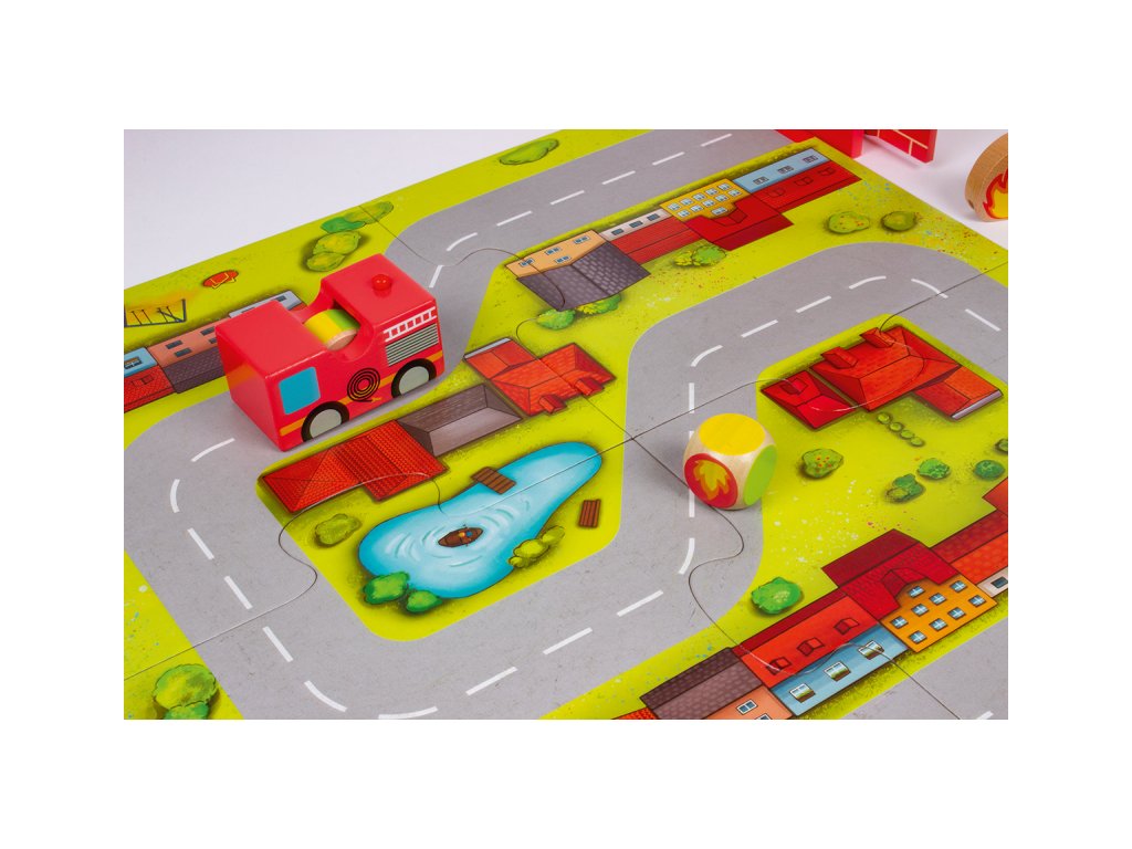Budova horí a požiar sa šíri! Našťastie sú všetci ľudia a zvieratá v bezpečí. Hasiči sa teraz ponáhľajú uhasiť plamene! Prvý hráč hodí kockou a pohne autom po hracej ploche, kým sa neobjaví farba, ktorú hodil. Ak padne červená, situácia sa zhoršuje: musíte umiestniť plameň do okna budovy, čím sa oheň ďalej šíri! Následne hádže ďalší hráč a hra pokračuje rovnakým spôsobom.