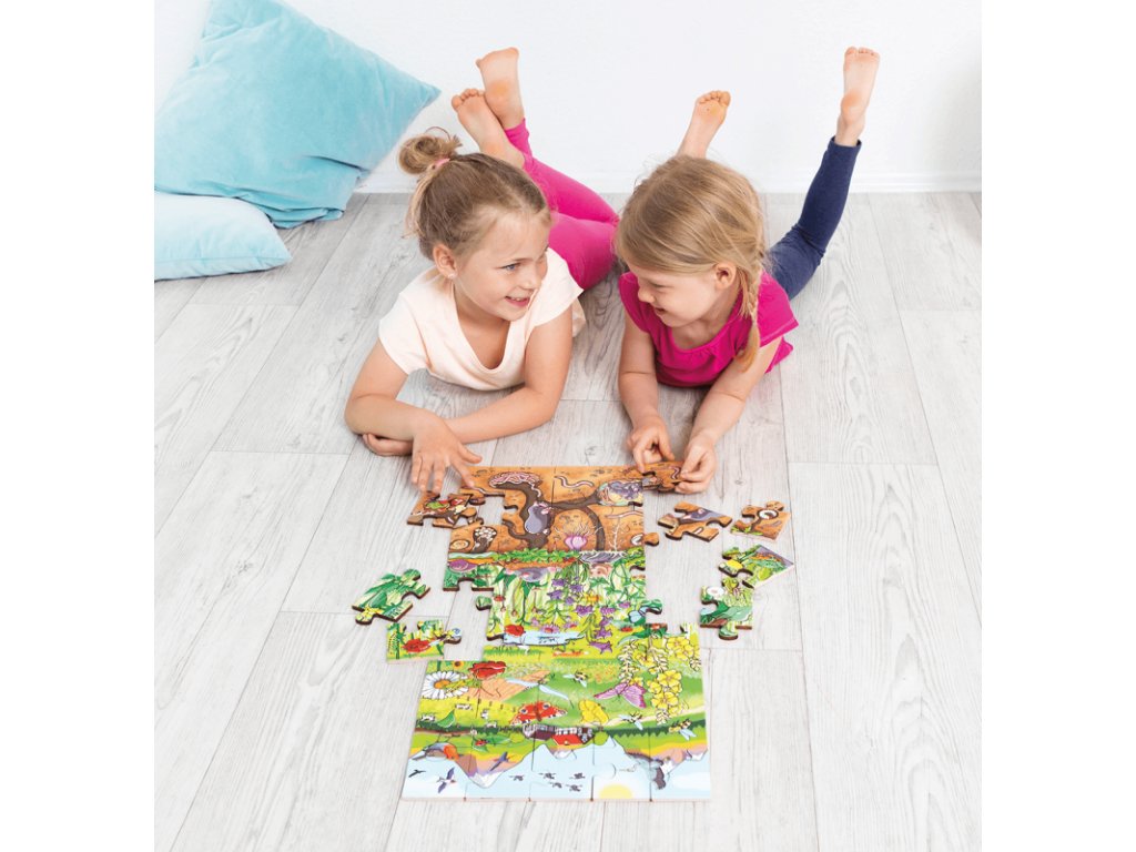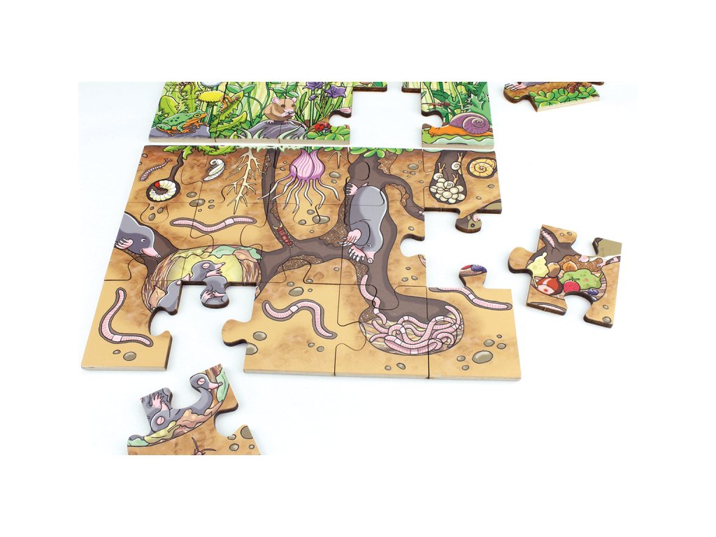 Podlahové puzzle vás prekvapí množstvom detailov a živými farbami. Pri jeho skládaní sa ocitnete v rozprávkovej krajine lúky plnej krásy .Toto puzzle nie je len obyčajnou hrou, je to cesta objavovania a poznávania sveta zvierat a rastlín, ktorá zaujme každého.