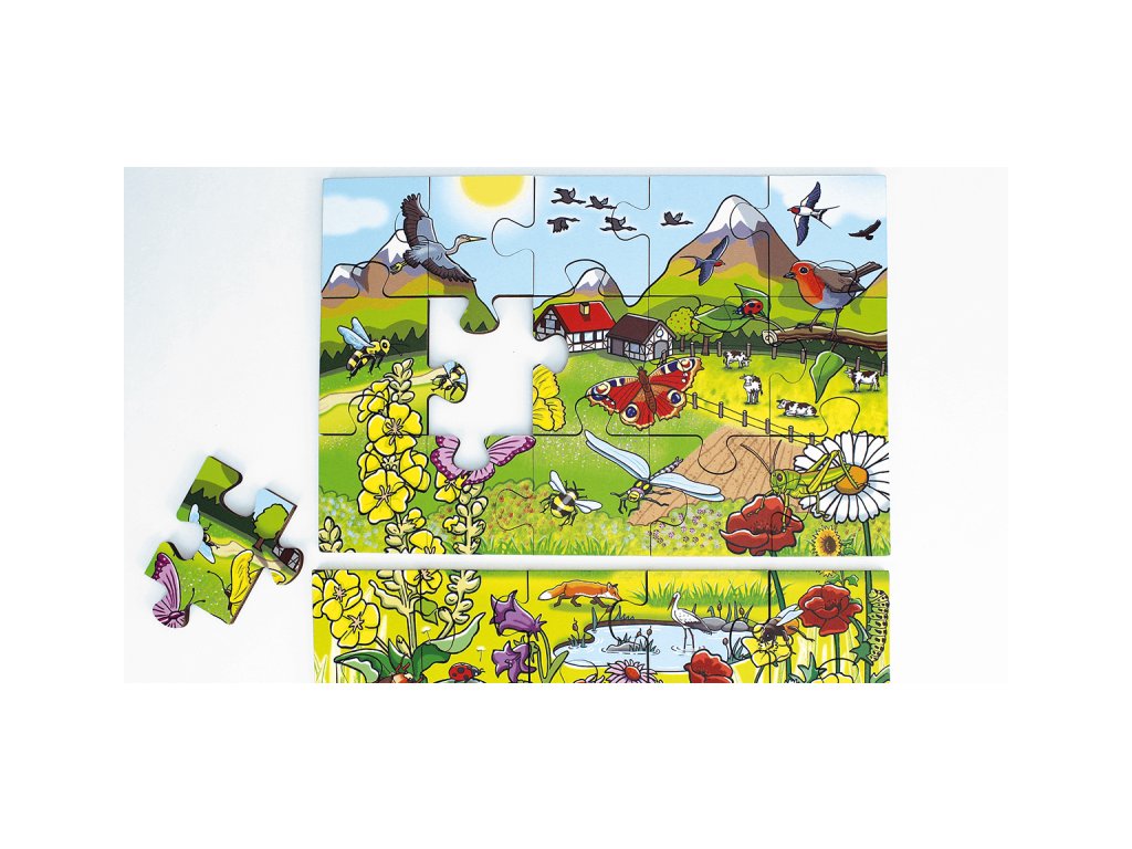 Puzzle zobrazuje nádhernú krajinu, rozdelenú do troch vrstiev, ktoré vám umožnia objaviť fascinujúci svet rastlín a živočíchov žijúcich na lúke.