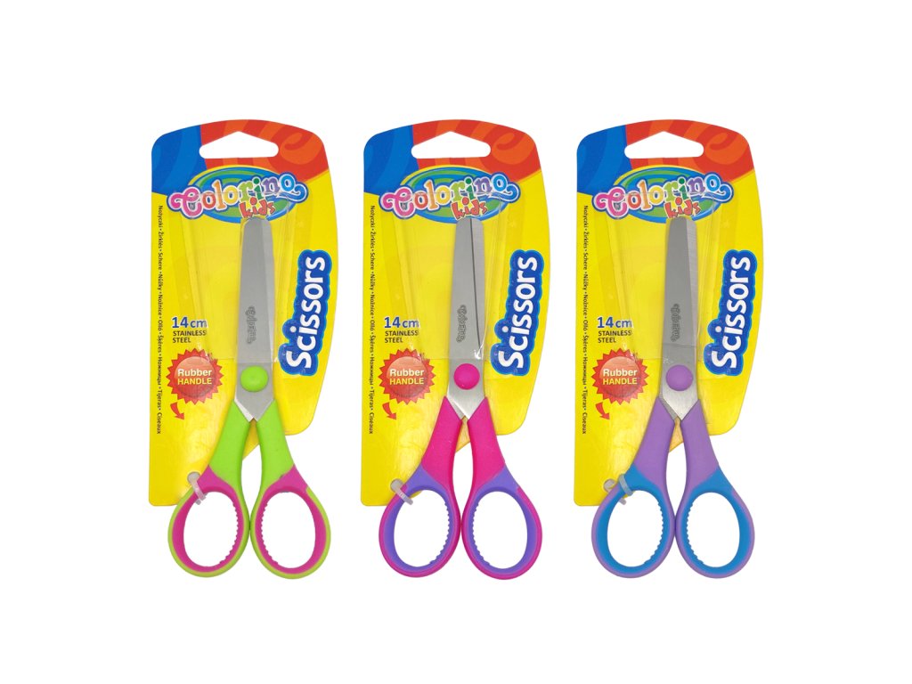 Farebné detské nožnice s mäkkými protišmykovými gumovými držadlami.Dodatočné parametre