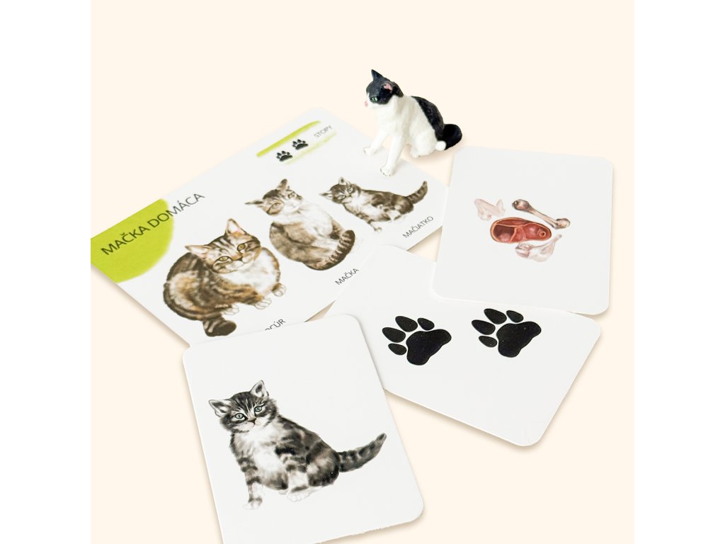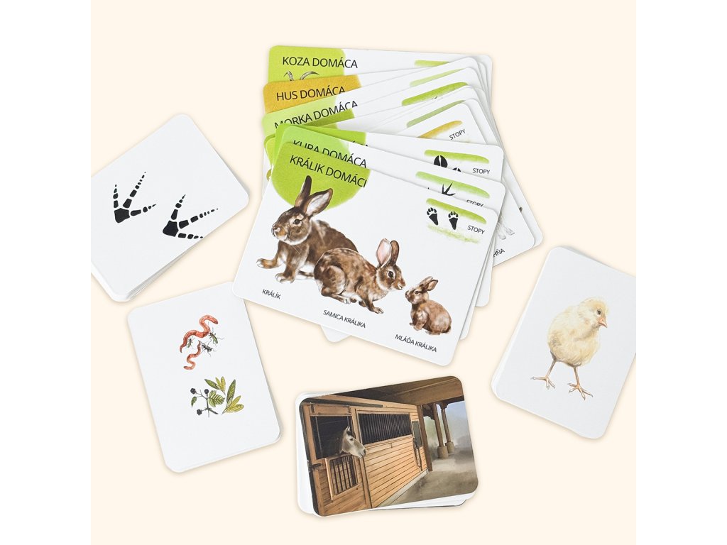 - vytvárajte dvojice s edukačnými kartami A7 - mláďa - dospelý jedinec / zviera - stopa / zviera - potrava