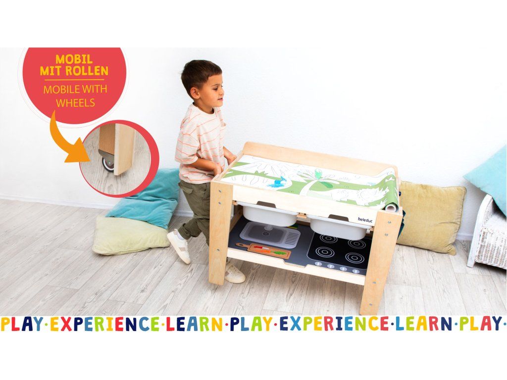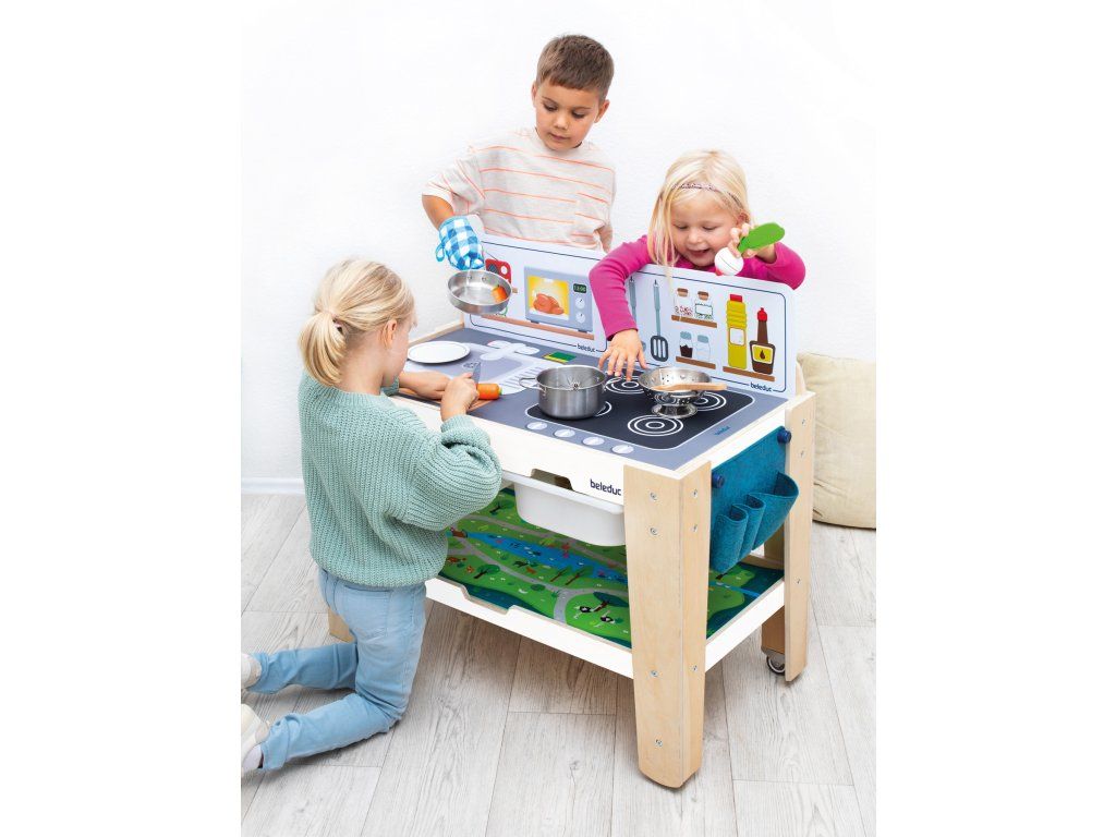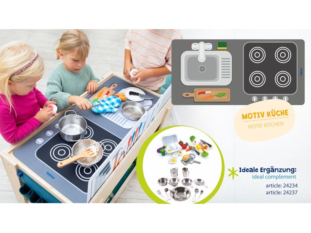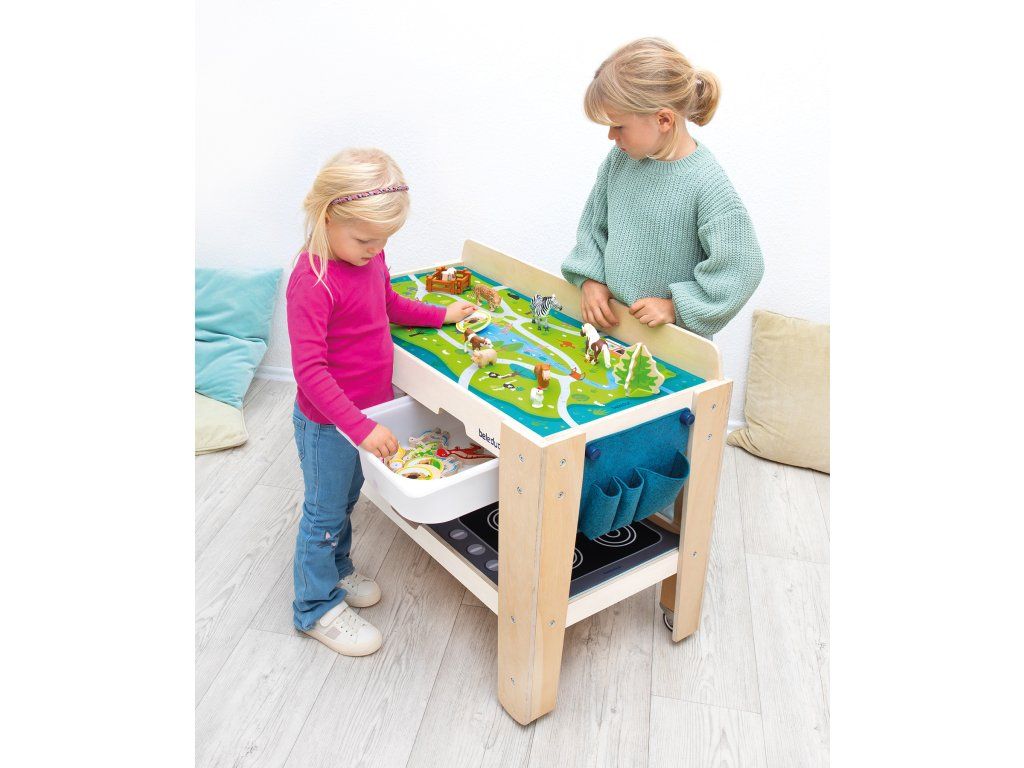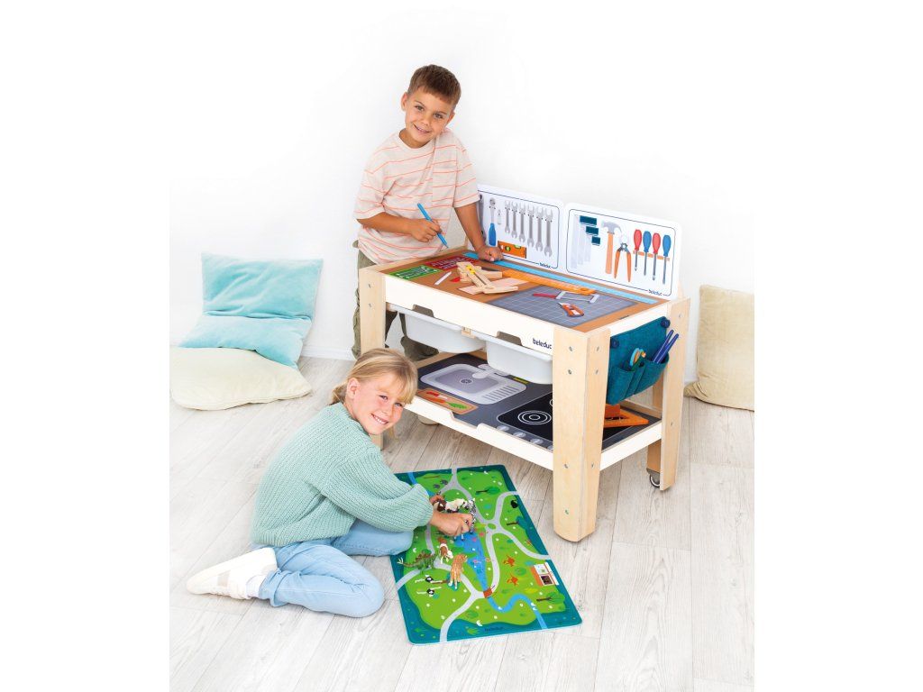 Tento multifunkční stůl podporuje fantazii a kreativitu! Sada obsahuje čtyři vyměnitelné herní podložky s různými, stimulujícími motivy. Ať už je to kuchyňka pro malé kuchaře, mechanická dílna pro opravdové řemeslníky, živá ulice nebo pěkný park – podložky poskytují perfektní základ pro kreativní hraní rolí. Vše v jednom: hraní, vaření, tvoření, ruční práce, malování a mnoho dalšího. Herní stůl navíc nabízí praktický úložný prostor se dvěma snadno přístupnými úložnými nádobami a dalším úložným prostorem pod deskou stolu a také plstěným vakem na boku. Ideální pro organizaci hraček a doplňků.Diskuze