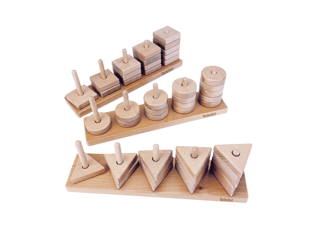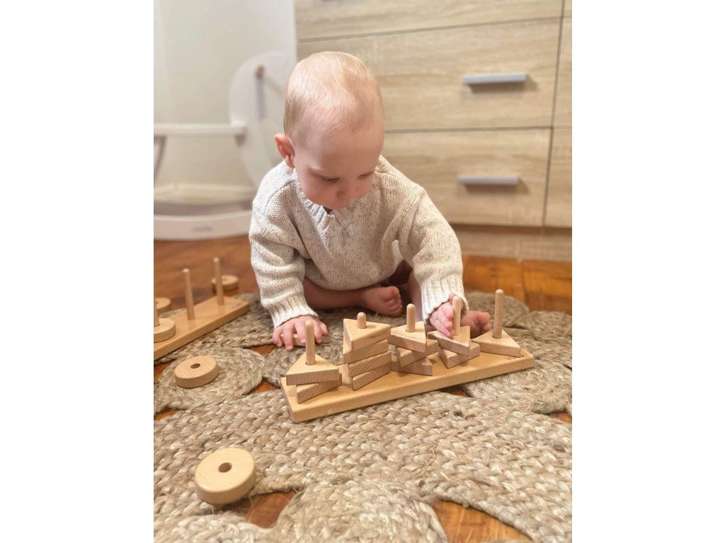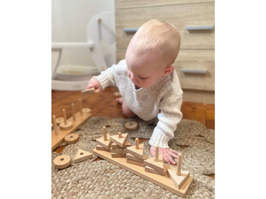Dřevěná geometrická hra je ideální pro objevování tvarů, velikosti, uspořádání, přiřazování a počítání. Hraní se 3 tvary také podporuje jemnou motoriku a koordinaci rukou a očí.