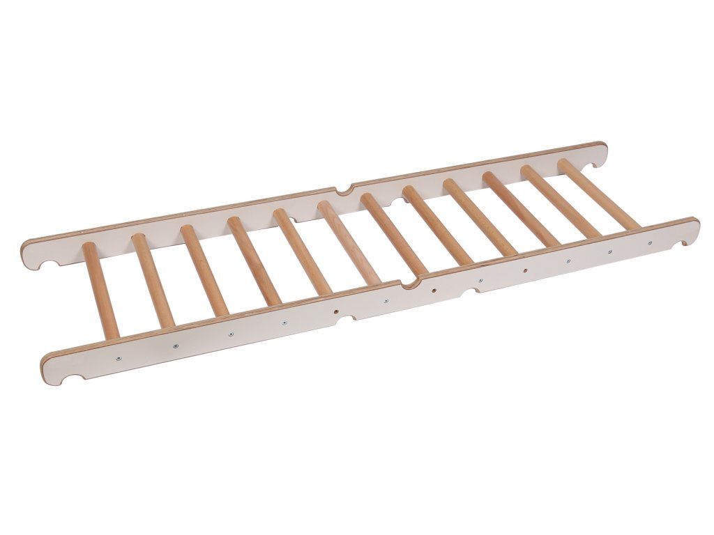 Modulární šplhací žebřík vyrobený z březové překližky a masivního bukového dřeva v přírodním dřevě a bílé barvě.