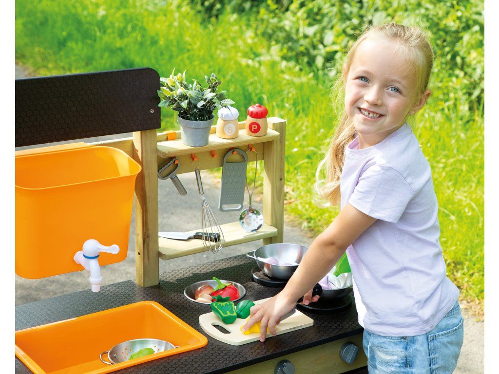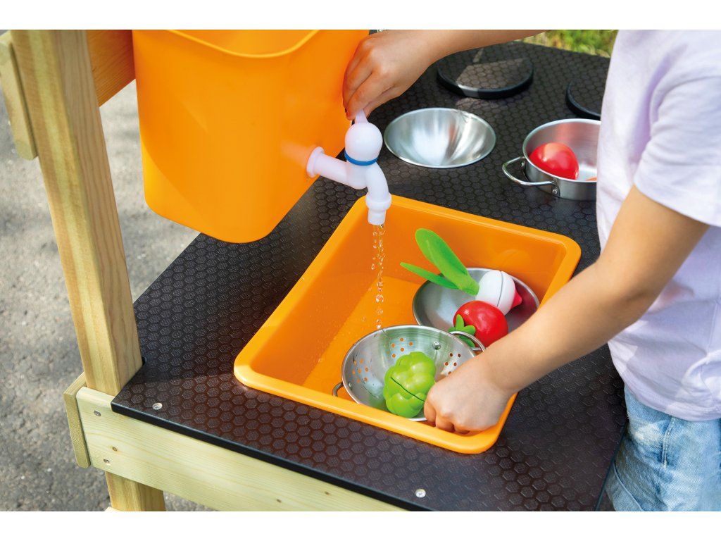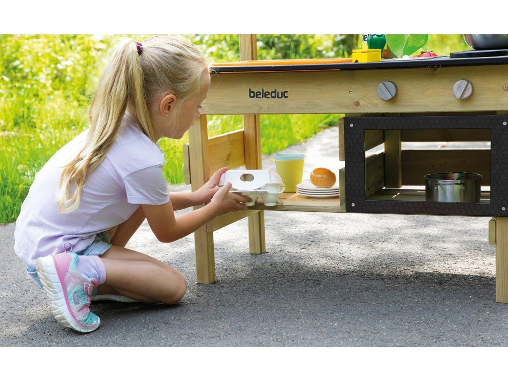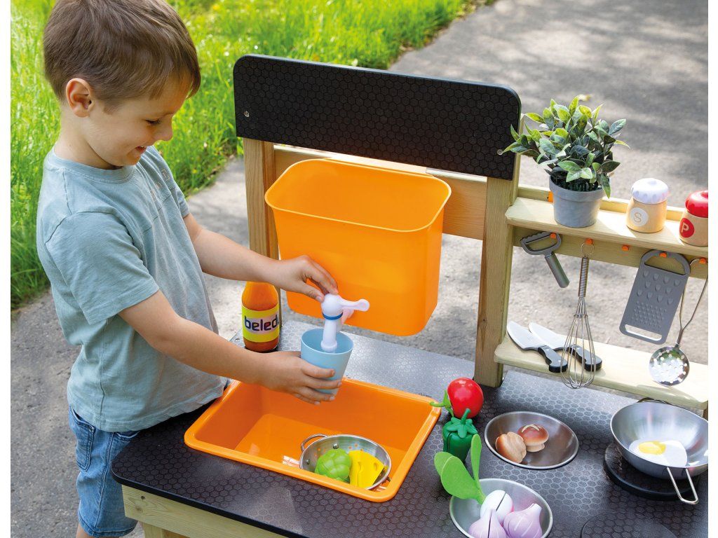 Herní kuchyňka umožňuje dětem vžít se do role malých šéfkuchařských hvězd. Několik dětí se může shromáždit u široké pracovní desky a společně vytvářet ta nejúžasnější jídla. Mohou „vařit“ na sporáku a „péct“ své kreativní bahenní koláče v troubě. Police a integrované háčky poskytují možnosti uložení kuchyňského náčiní. Venkovní herní kuchyňka je odolná vůči povětrnostním vlivům a vyrobena z pevného dřeva a rostlinného plastu s certifikací FSC.