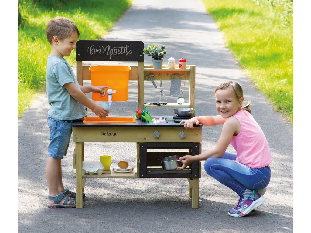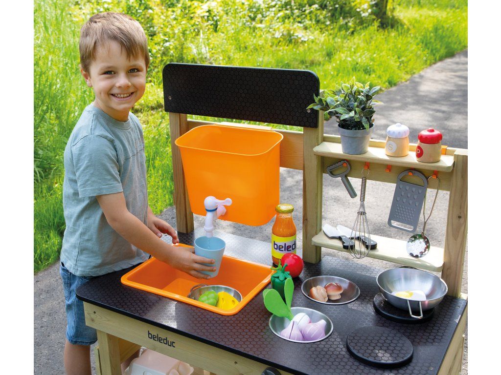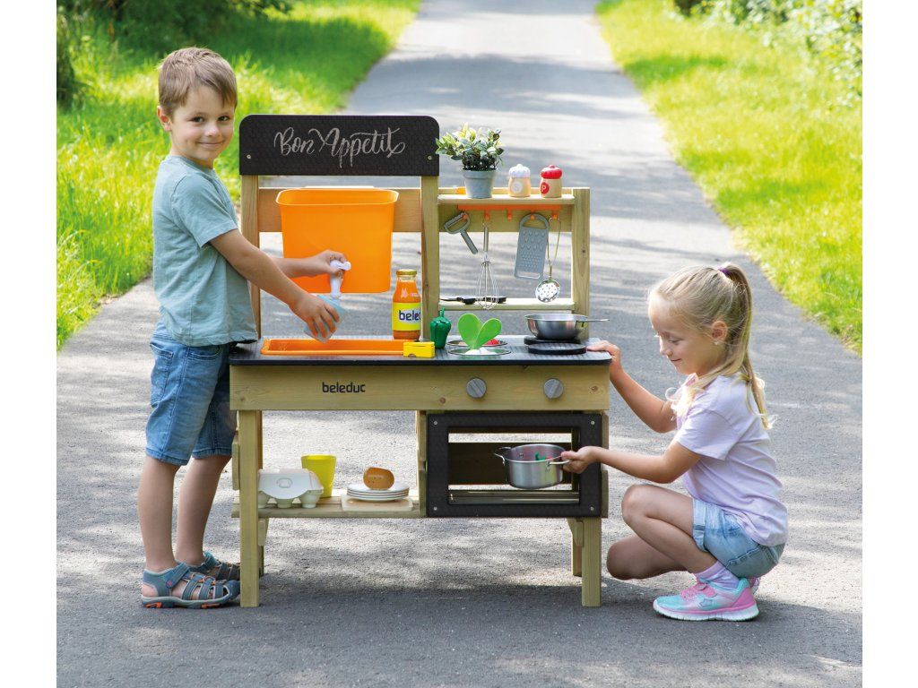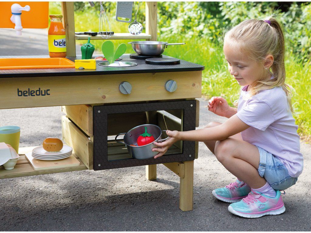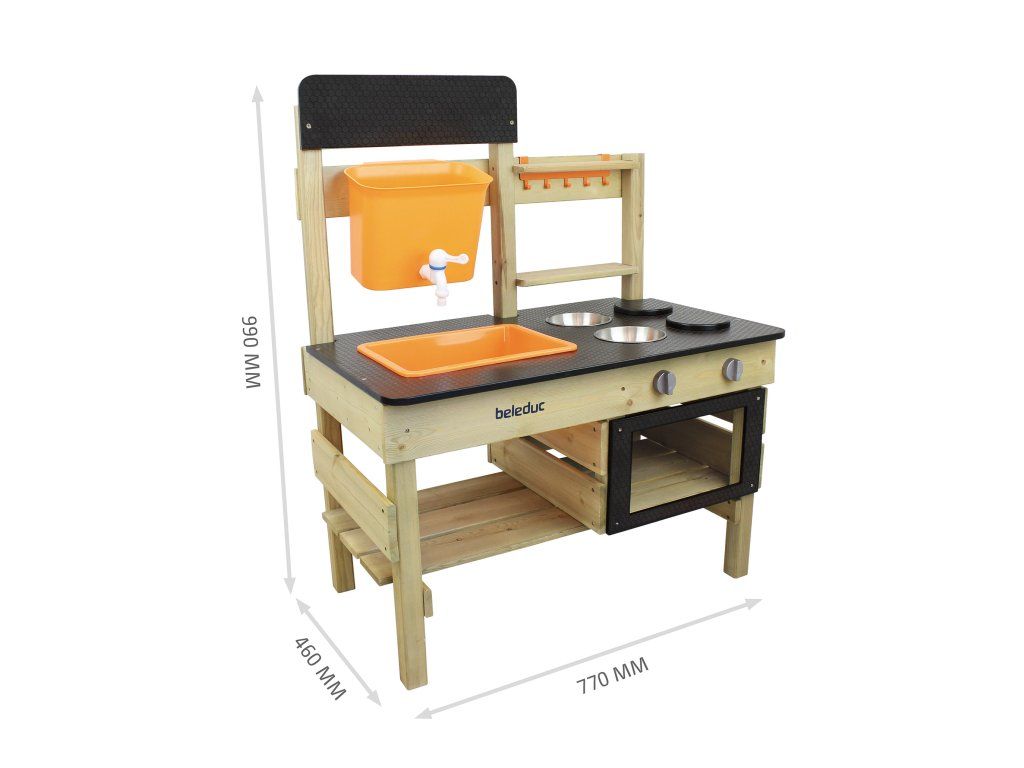 Herní kuchyňka umožňuje dětem vžít se do role malých šéfkuchařských hvězd. Několik dětí se může shromáždit u široké pracovní desky a společně vytvářet ta nejúžasnější jídla. Mohou „vařit“ na sporáku a „péct“ své kreativní bahenní koláče v troubě. Police a integrované háčky poskytují možnosti uložení kuchyňského náčiní. Venkovní herní kuchyňka je odolná vůči povětrnostním vlivům a vyrobena z pevného dřeva a rostlinného plastu s certifikací FSC.