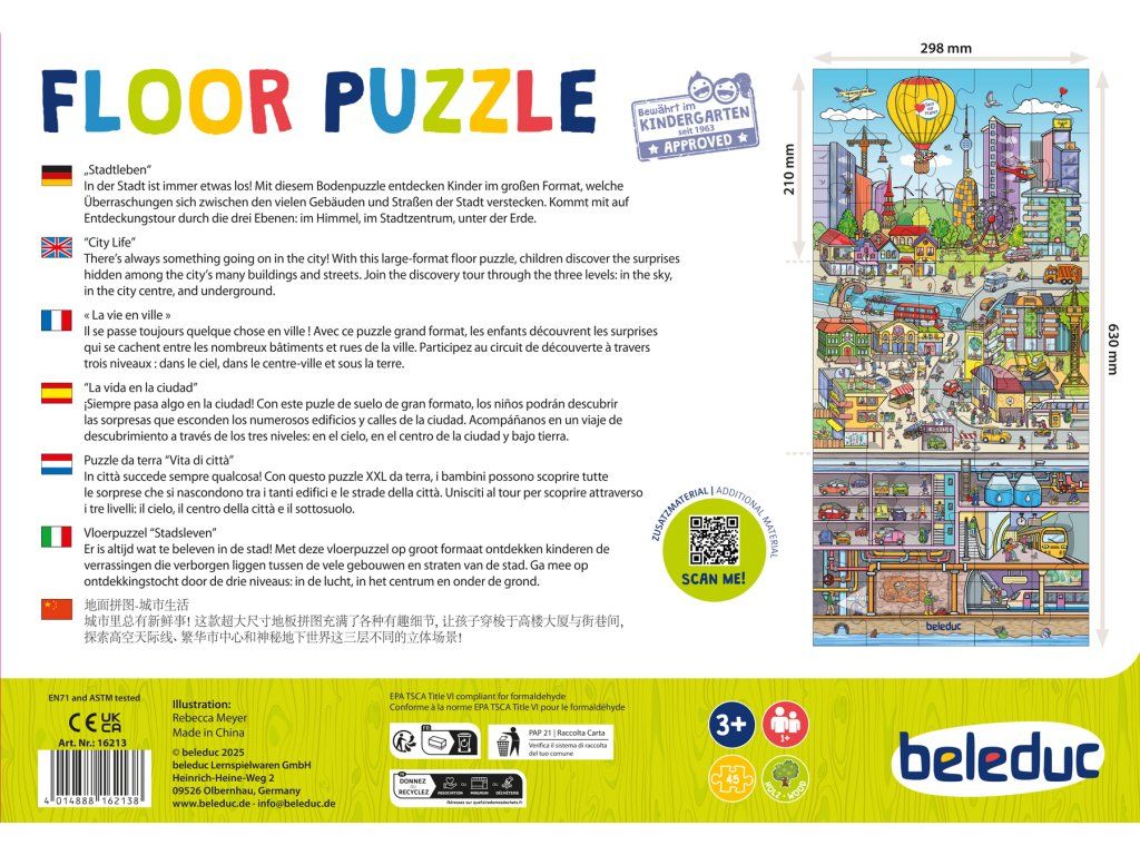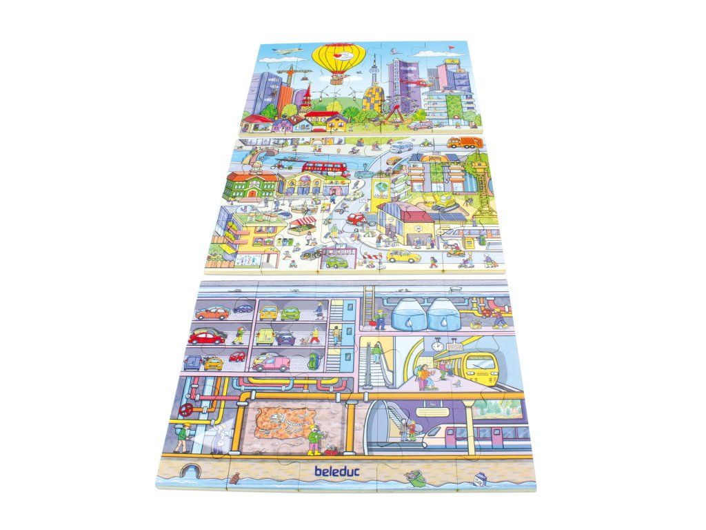 Ve městě se pořád něco děje! S touto velkoformátovou podlahovou skládačkou děti objeví překvapení skrytá mezi mnoha budovami a ulicemi města. Připojte se k objevitelské prohlídce tří úrovní: na obloze, v centru města a v podzemí.Diskuze