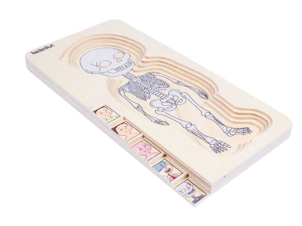 Puzzle zobrazuje uspořádání lidského těla popisným a dětem srozumitelným způsobem. Od kostry přes orgány a svaly, znázorňující krevní oběh; od nahého dítěte až po plně oblečené dítě.