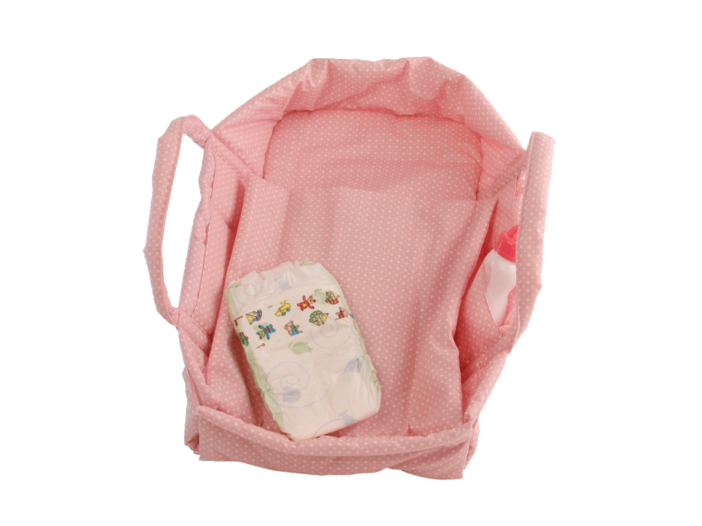 Korbička, kterou lze použít i na přebalování! Milující rodiče panenek mají plenky a láhev s vodou vždy po ruce, protože po stranách má dvě kapsy. Vhodná pro panenky Schildkröt "Finn" a "Lina".