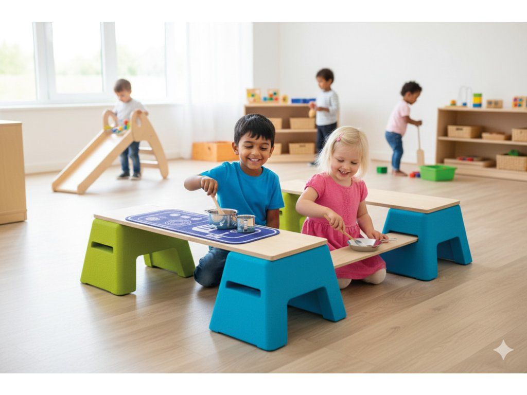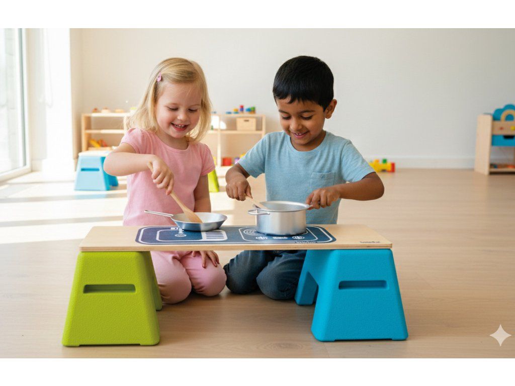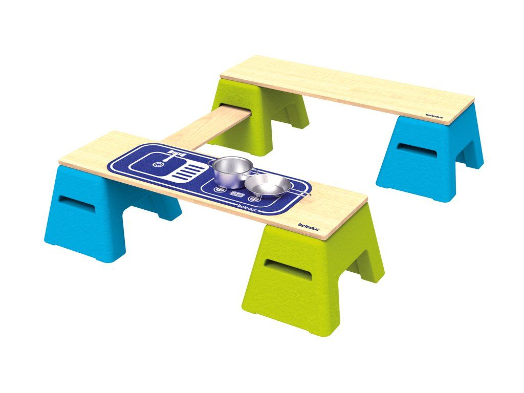 Dva kompaktní blokové prvky z materiálu EPP lze snadno sestavit se sedáky a spojovacími deskami a vytvořit tak dlouhé sedací soupravy. Toto uspořádání zajišťuje, že každé dítě má útulné místo pro skupinové aktivity a hry, čtení pohádek nebo si prostě jen užívat společné klidné chvíle. Lavice se stejně rychle promění v hrací stoly, u kterých si mohou pohodlně hrát i ti nejmenší. Jejich výška vhodná pro děti podporuje samostatnou práci a kreativní hru. Sada obsahuje také oboustrannou plstěnou podložku s potiskem dvou poutavých motivů: Housenka s čísly vybízí k hravému objevování prvních čísel a porozumění množstvím. Druhá strana zobrazuje motiv kuchyně, který inspiruje k nápadité hře rolí.Diskuze
