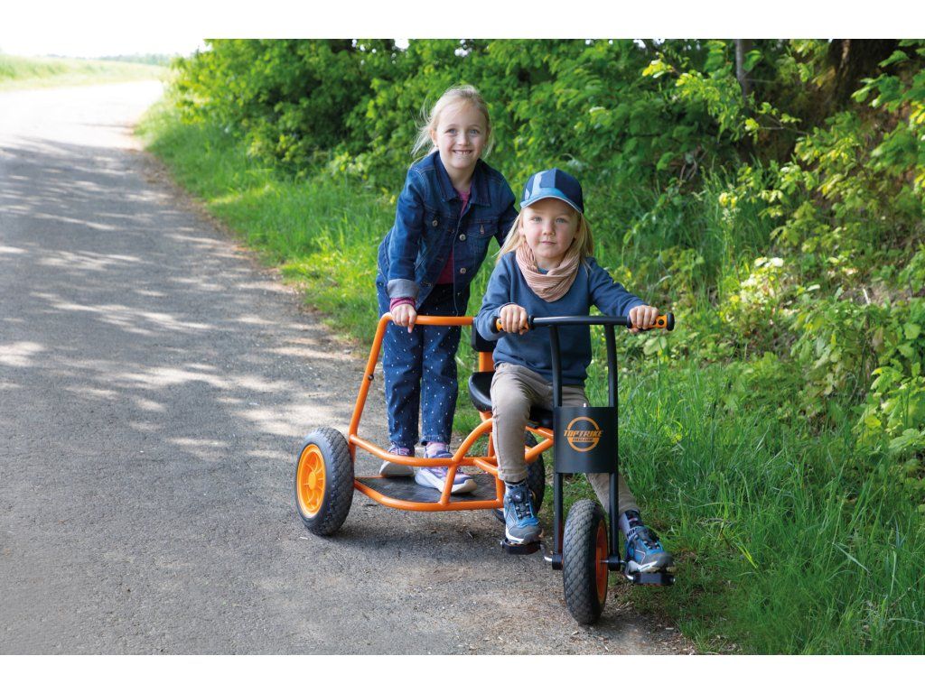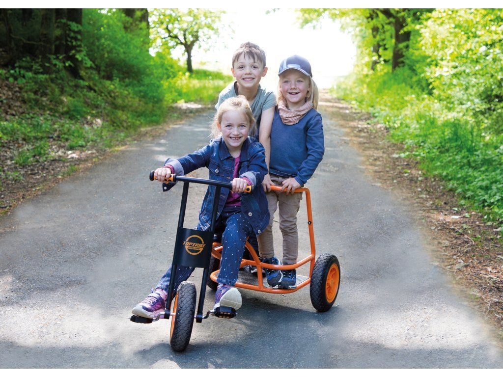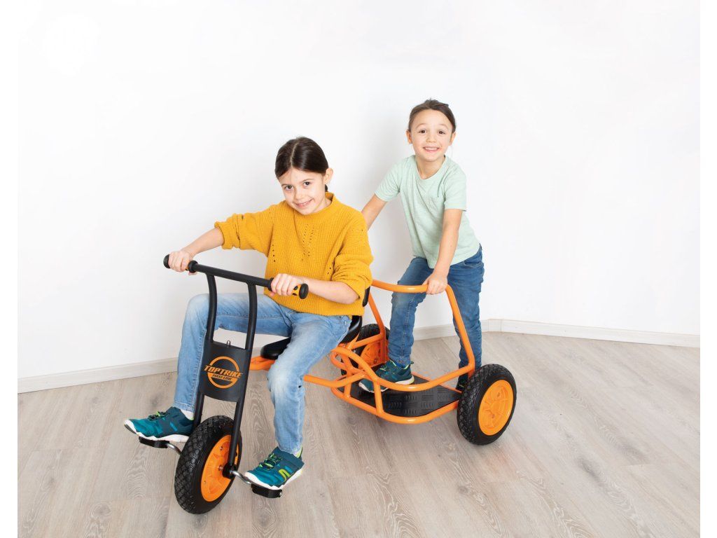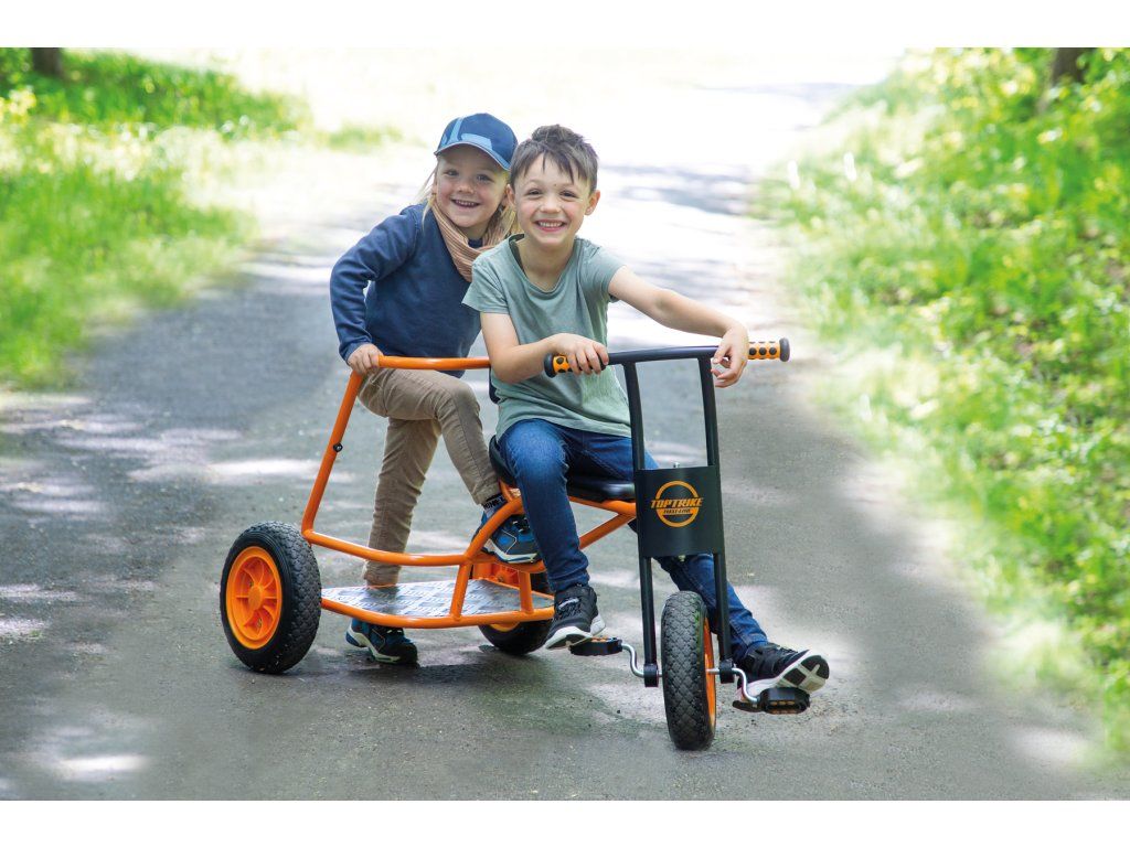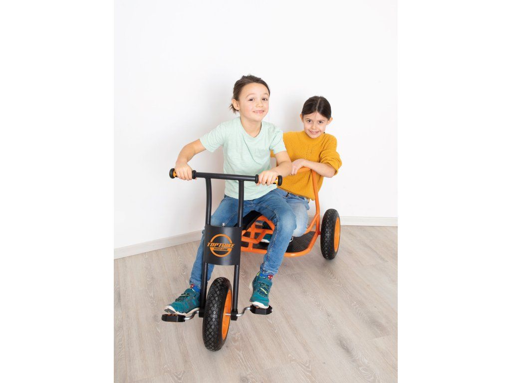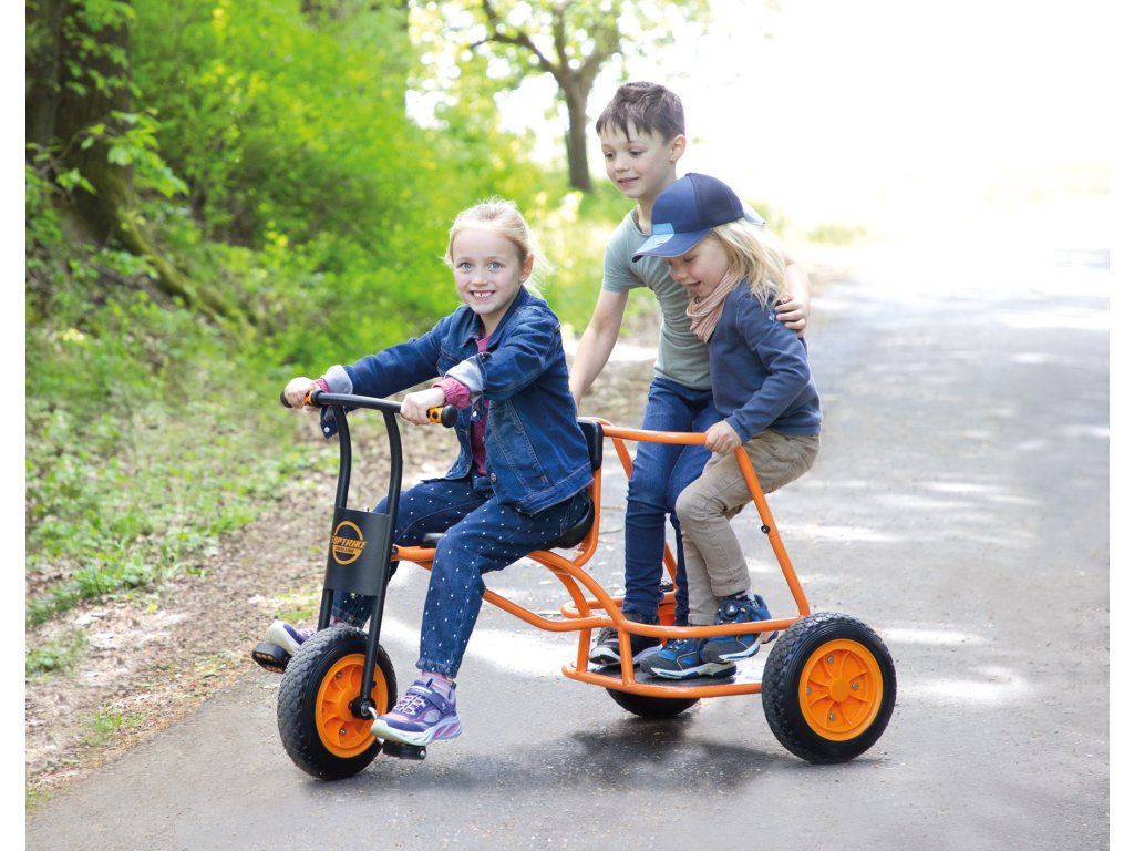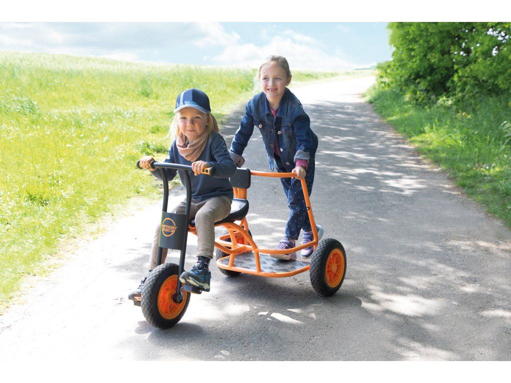 Naše nová tříkolka Shuttle „Maxi“ se rychle stává velkou atrakcí na hřištích a školních dvorech: při hraní rolí se tříkolka promění v taxi, vůz starých Římanů nebo v hasičské či policejní auto spěchající na záchrannou misi. Mottem je „naskoč – vyskoč“, protože tříkolka je vhodná pro více dětí. Jedno dítě může řídit vpředu, zatímco několik dětí může stát a jezdit vzadu. Díky odolnému práškovému lakování hliníkové stupačky je tříkolka perfektně vybavená a díky žebrované konstrukci je protiskluzová. Extra velké robustní pneumatiky dělají z tříkolky Shuttle ideální vozidlo pro starší děti.Diskuze