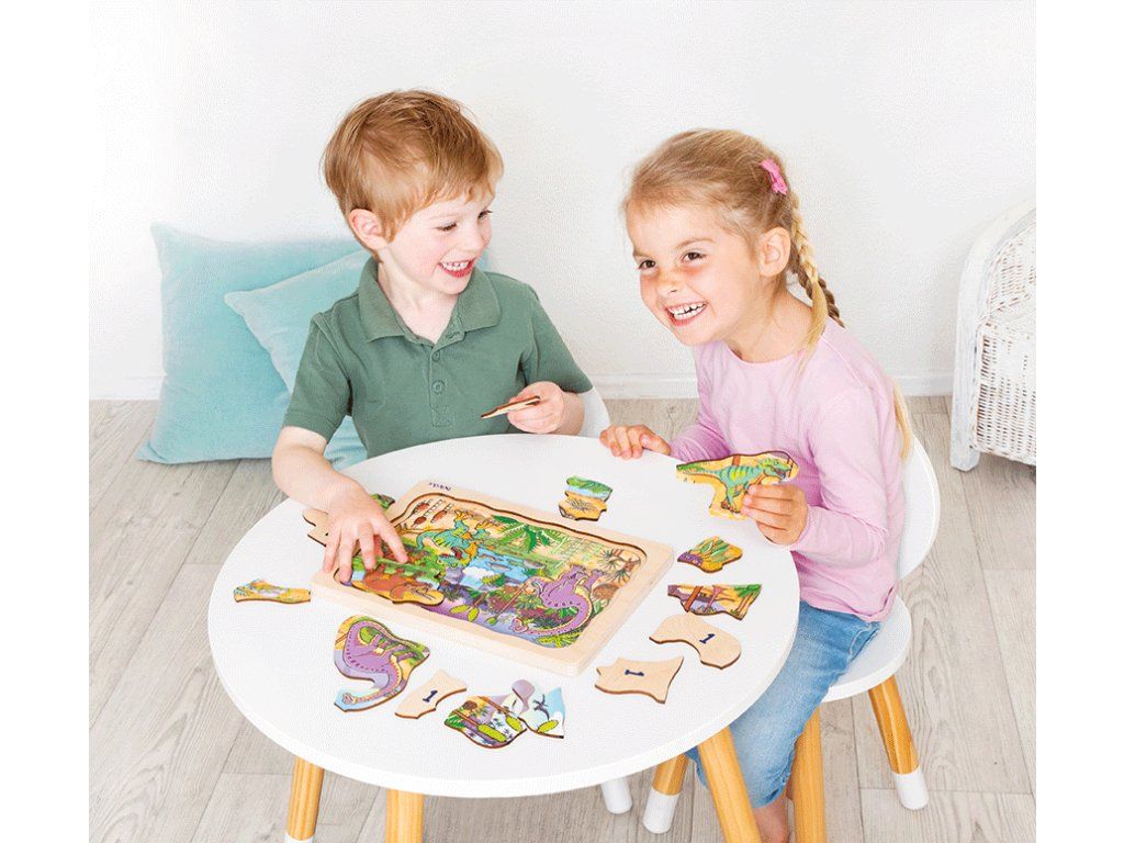 S touto vzrušující skládačkou mohou děti objevovat svět dinosaurů. Co dinosauři jedí a jak se líhnou z vajec? Děti se učí všechna tato témata hravou formou. Dinosaury lze vyjmout jako figurky a porovnat je s předměty ze současného světa? Jak velký je dinosaurus ve srovnání s člověkem? Zde děti dostanou odpověď! S pomocí fólie se kostry stanou viditelnými a efekt záře ve tmě poskytuje ve tmě zajímavé detaily (např. sopku). Na druhé fólii děti vidí srovnání velikosti. (jak velký musel být dinosaurus ve srovnání s autobusem nebo autem) Je zde spousta věcí k objevování!Diskuze